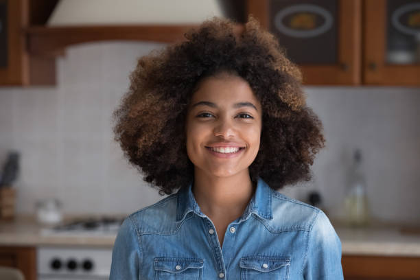 Head shot beautiful African teenage girl posing alone in domestic kitchen at home smile look at camera, having wide toothy charming smile and natural curly hairs. Beauty, gen Z person portrait concept
